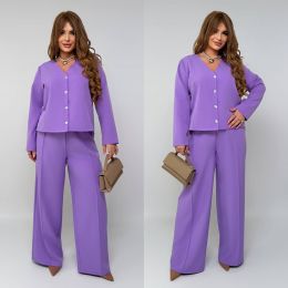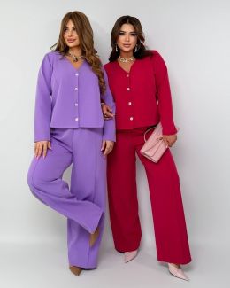 Штани з високою посадкою , пояс на гумці , бічні кишені , з переду стрілки . Піджак на ґудзиках з заду завʼязка .