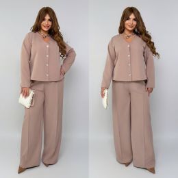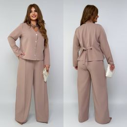 Штани з високою посадкою , пояс на гумці , бічні кишені , з переду стрілки . Піджак на ґудзиках з заду завʼязка .