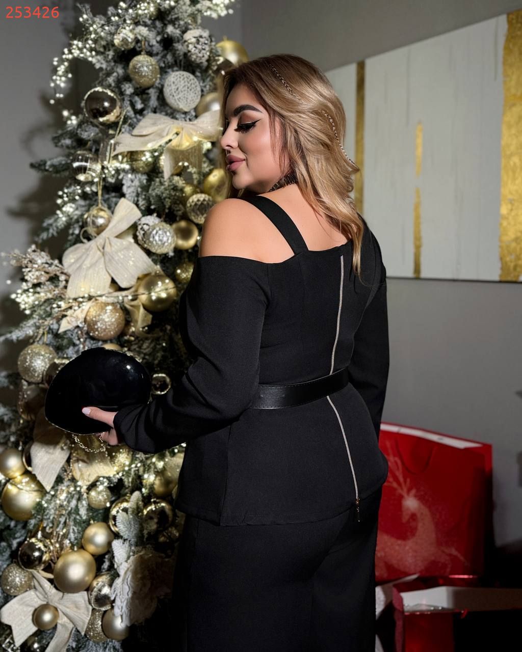 Нарядний костюм-двійка : блуза цікавого крою : одне оголене плече з прикрасою, V- образний виріз, низ кльош з розрізом , по спинці золота молнія, чорний пояс з прикрасою йде в комплекті.