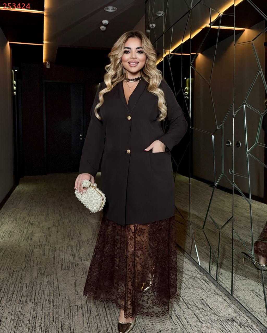 Нарядний костюм-двійка : жакет застібається на золоті ґудзики, комір-стійка , з боків великі кишені , довгий рукав; спідниця на резинці на трикотажній підкладці.