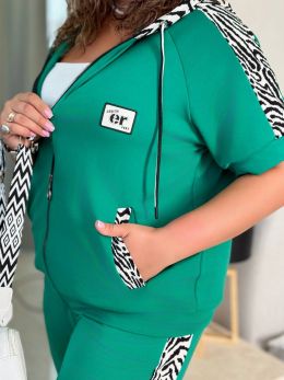 Кофта вільного силуету з капюшоном , кишені листочки. Прикрашений вставками з леопарда і обструкції. Рукав на манжеті.