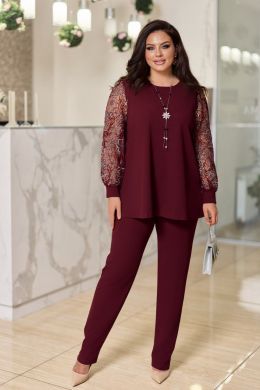 Неймовірно жіночний образ. Костюм складається з блузи та штанів. Блуза по спинці застібається на гудзик. Окрасою служать широкі рукави, виконані з сітки із сріблястим напиленням, що створює делікатне мерехтіння.