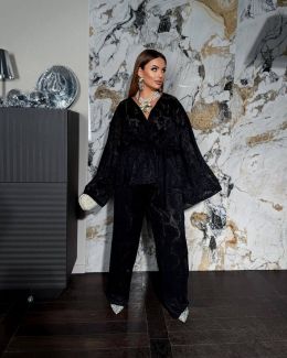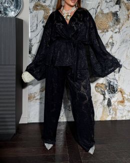 Довжина брюк 77/110. Пояс на гумці, висока посадка. Кардиган одягається на запах, підвʼязується поясом . Рукава внизу широкі.