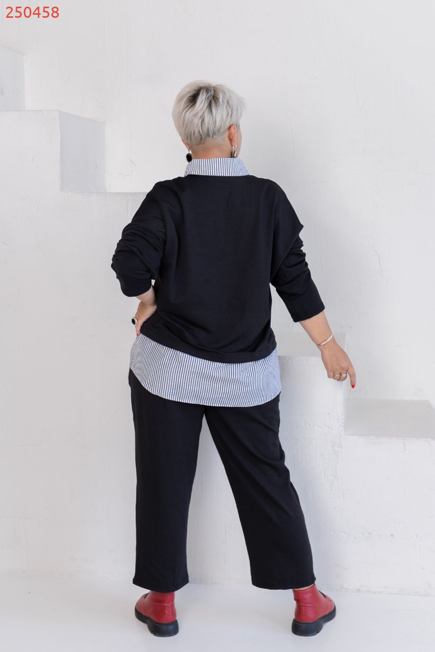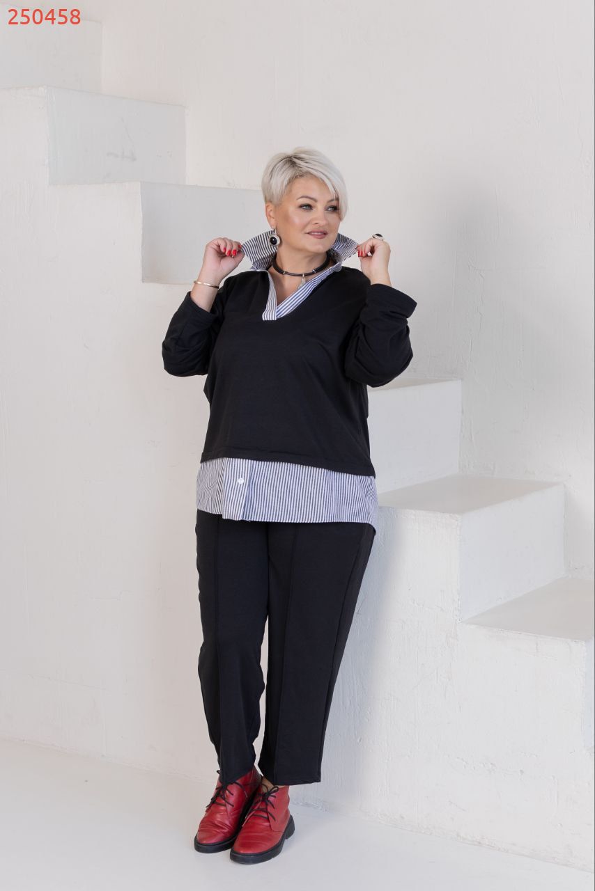 Стильний костюм виготовлений з якісної двунитки гарної розтяжності та котону. Подовжена туніка вільного крою, V-подібний виріз візуально звузить плечі і зробить фігуру стрункішою.