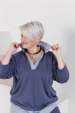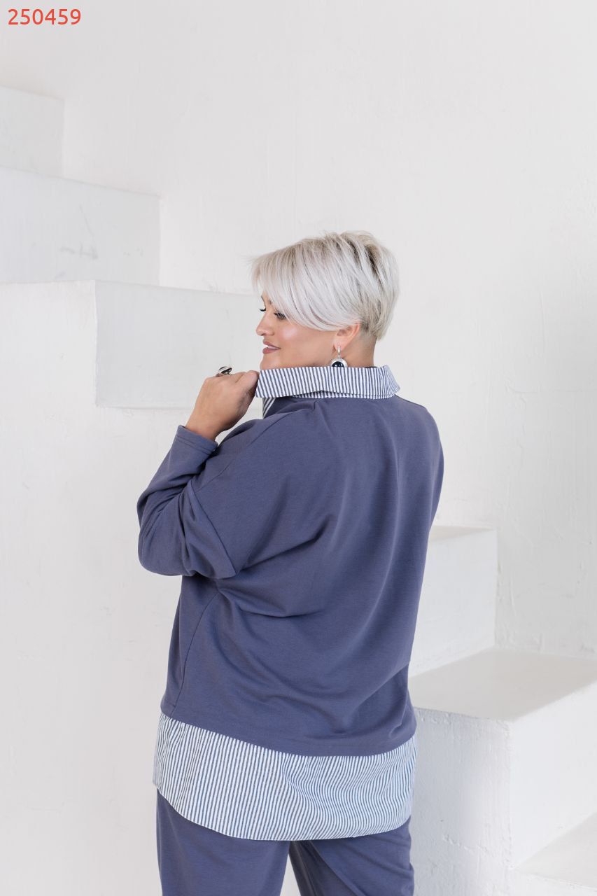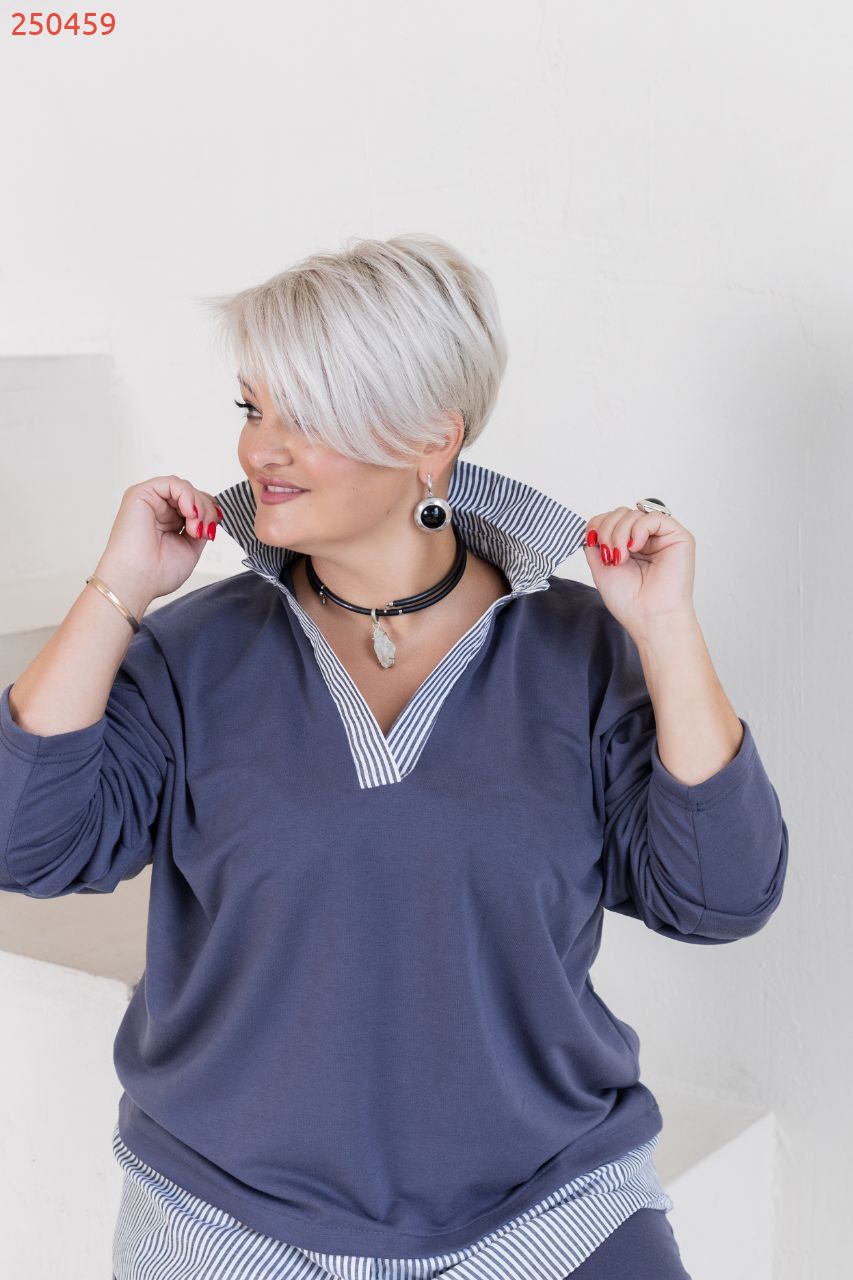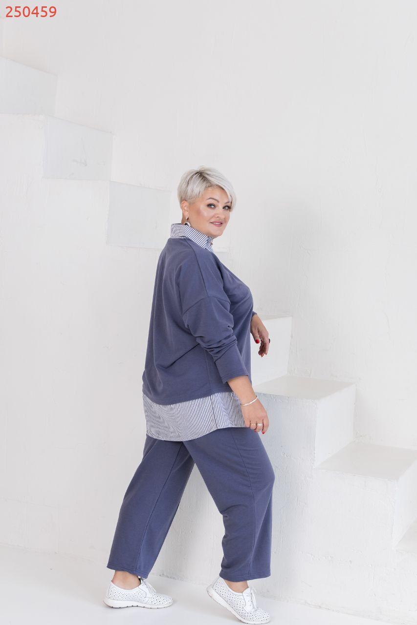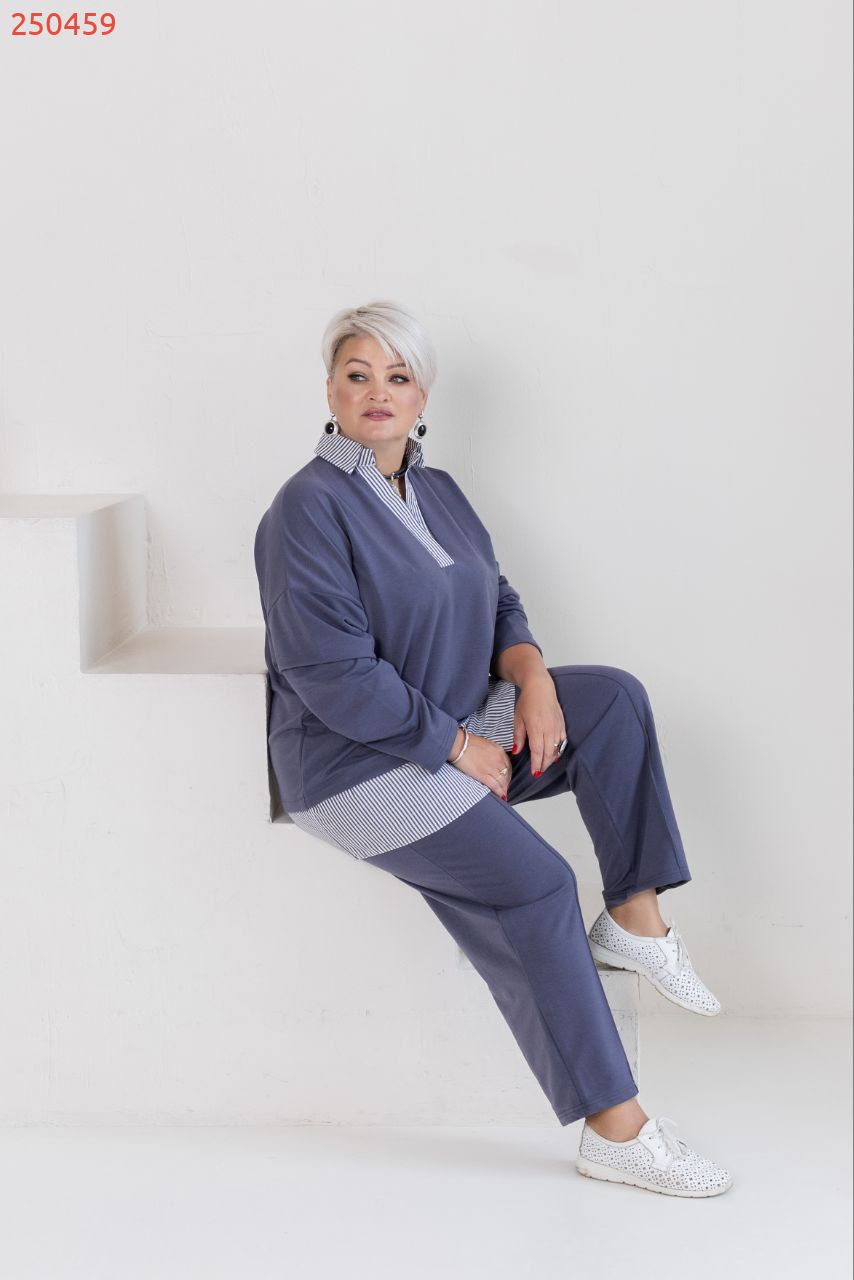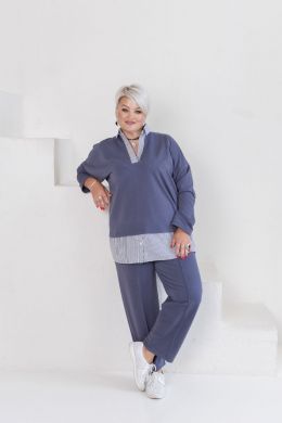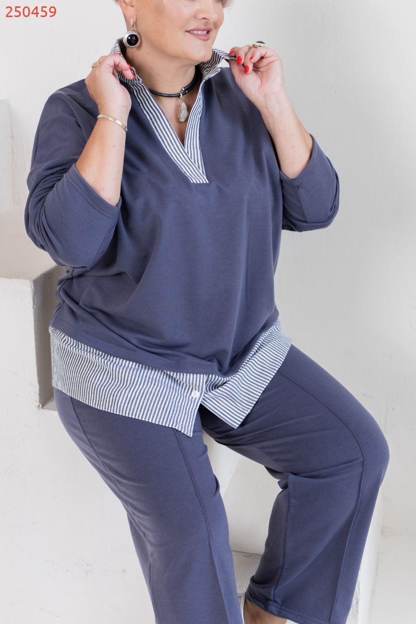 Стильний костюм виготовлений з якісної двунитки гарної розтяжності та котону. Подовжена туніка вільного крою, V-подібний виріз візуально звузить плечі і зробить фігуру стрункішою.