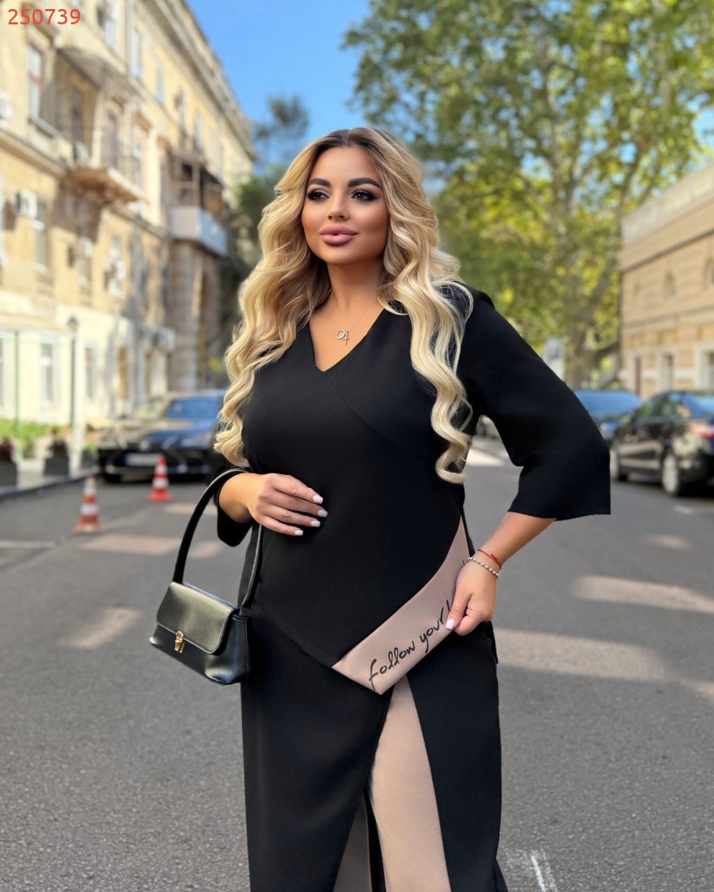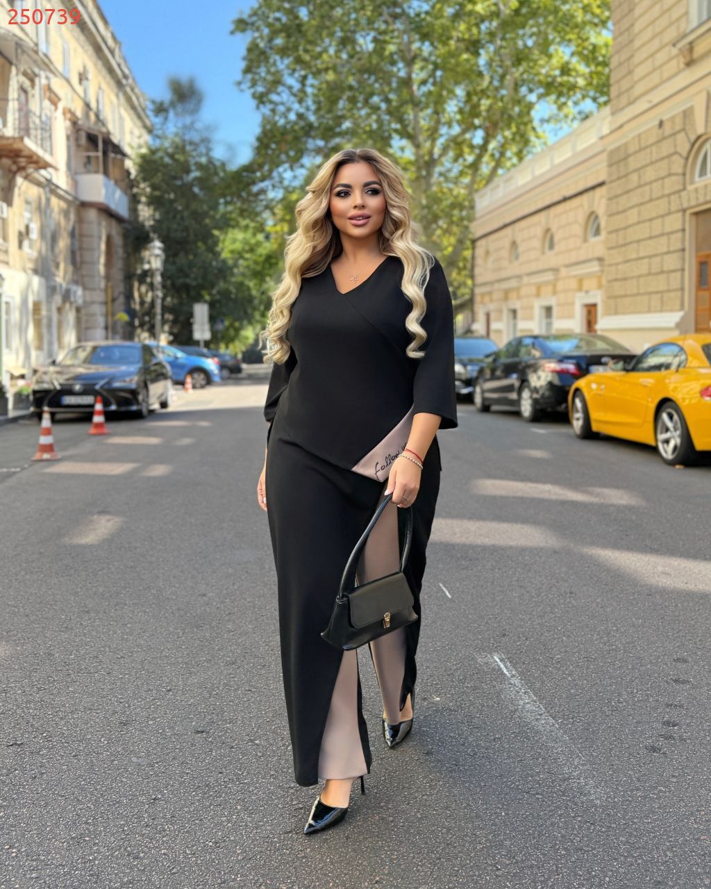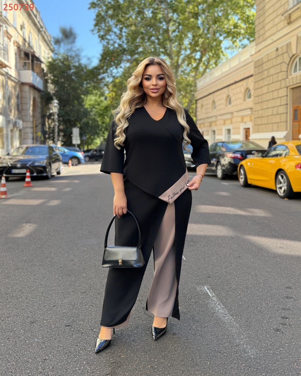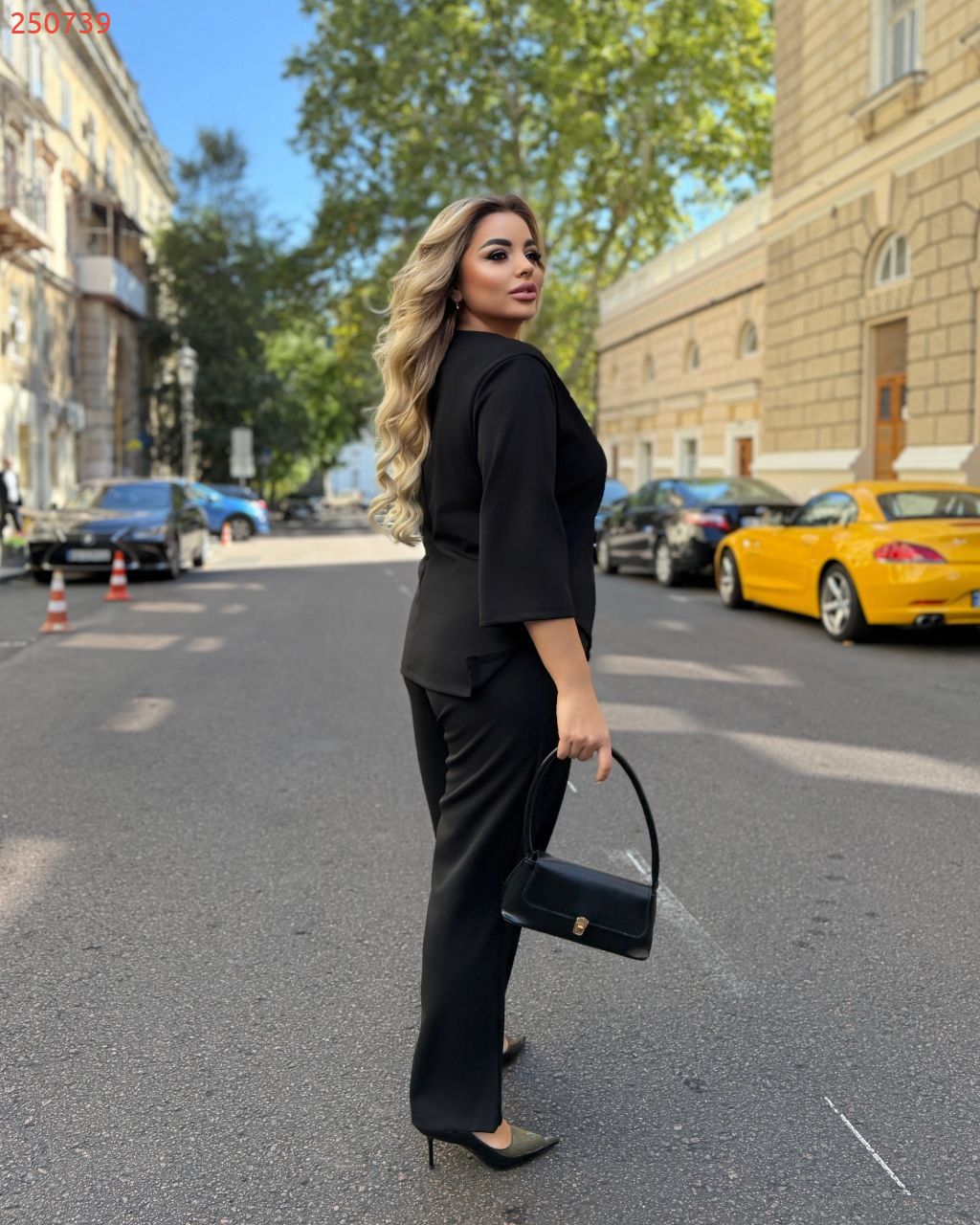 Стильний костюм двійка, тканина тягнеться. Блуза з імітацією запаху та асіметричним низом, прикрашена яскравою планкою.