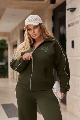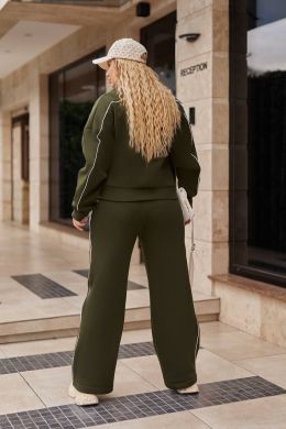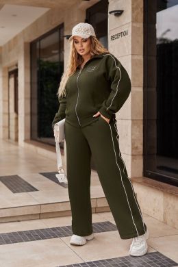 Кофта спереду має застібку молнію, на груді прикраса з камінчиками ( стрази),з врізними кишенями. На рукавах і на штанах - кантований лампас. Штани вільного крою , з кишенями, ідеальної посадки, в талії на гумці.