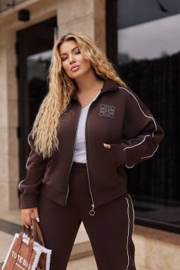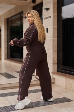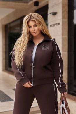 Кофта спереду має застібку молнію, на груді прикраса з камінчиками ( стрази),з врізними кишенями. На рукавах і на штанах - кантований лампас. Штани вільного крою , з кишенями, ідеальної посадки, в талії на гумці.