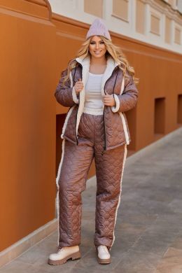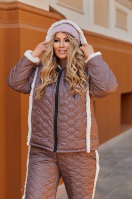 Комплект- куртка і штани, плащівка з силіконом, стьобаний цікавим дизайном, оформлен дуже красиво штучним хутром. Куртка вільного крою, з кишенями , спереду застібка -молнія , з капюшоном. Куртка повністю на підкладці зі штучного хутра. Штани стьобані вишивкою з звичайною підкладкою , теплі, висока посадка на резинці з кишенями і знизу прямі.