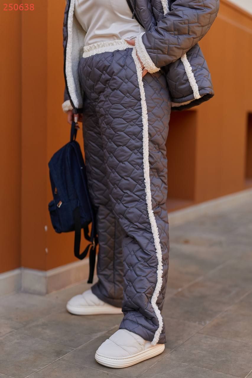 Комплект- куртка і штани, плащівка з силіконом, стьобаний цікавим дизайном, оформлен дуже красиво штучним хутром. Куртка вільного крою, з кишенями , спереду застібка -молнія , з капюшоном. Куртка повністю на підкладці зі штучного хутра. Штани стьобані вишивкою з звичайною підкладкою , теплі, висока посадка на резинці з кишенями і знизу прямі.
