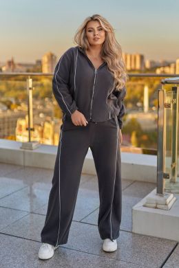 Кофта на блискавці з капюшоном вільного прямого крою, зручні кишені по боках, по низу на резинці з фіксатором,для коригування потрібного обʼєму і довжини. Кофта спереду і ззаду прикрашена кантом. Штани з кишенями, вільні,знизу на резинці з фіксацію, можна затягнути, по боках- подвійний лампас.