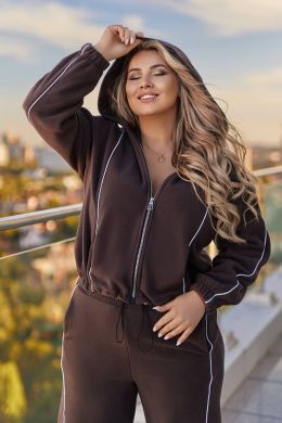 Кофта на блискавці з капюшоном вільного прямого крою, зручні кишені по боках, по низу на резинці з фіксатором,для коригування потрібного обʼєму і довжини. Кофта спереду і ззаду прикрашена кантом. Штани з кишенями, вільні,знизу на резинці з фіксацію, можна затягнути, по боках- подвійний лампас.