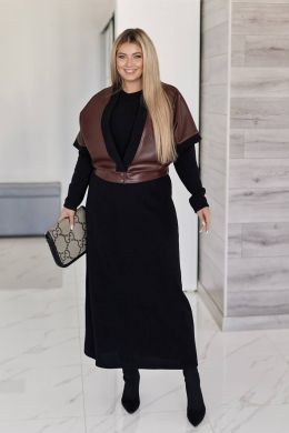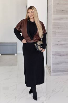 Верх: жилет , з еко шкіри, в поєднанні з трикотажем, на кнопках, вільного крою, з коротким рукавом. Задня частина зі збиранням на резинку для комфортної посадки.