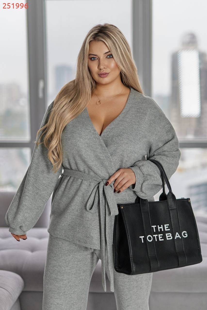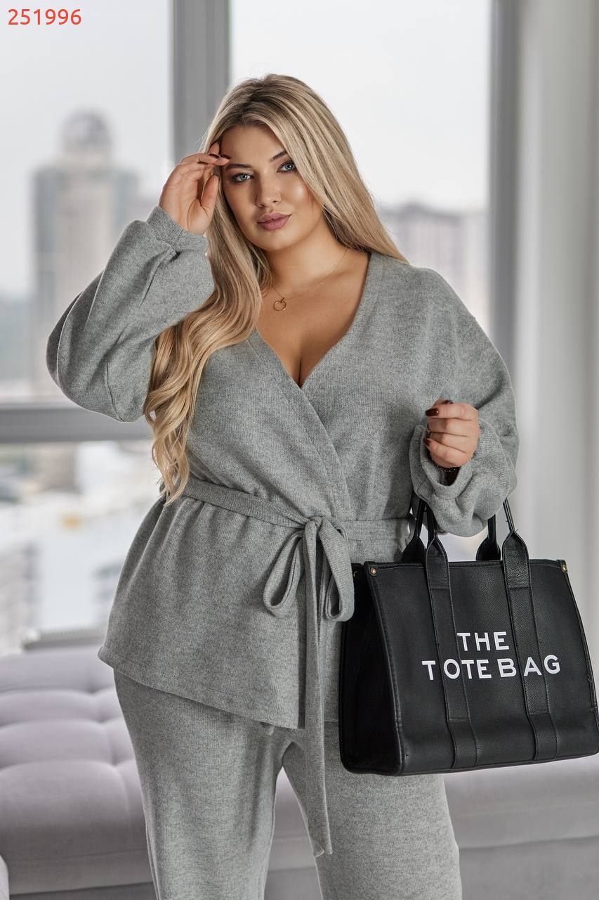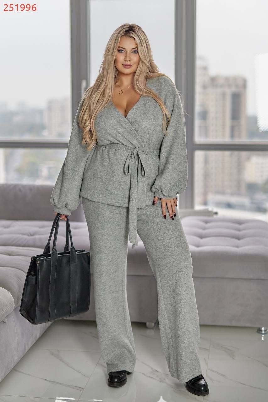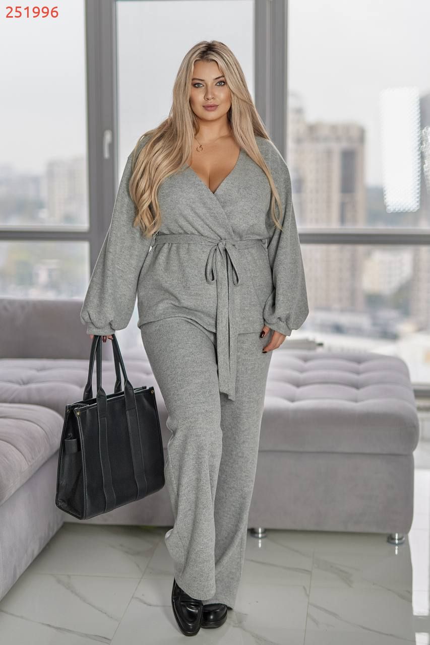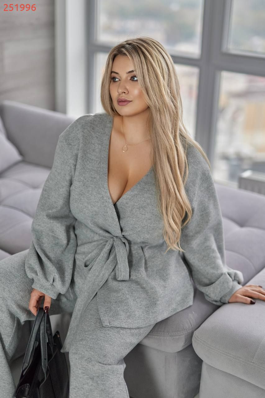 Комплект складається з вільного жакета із запахом і пояса та прямих широких брюк.