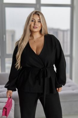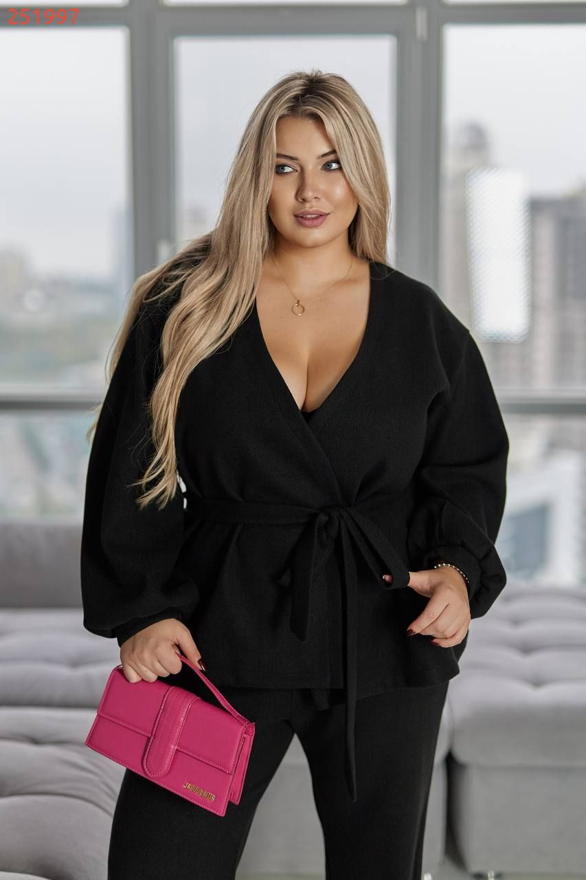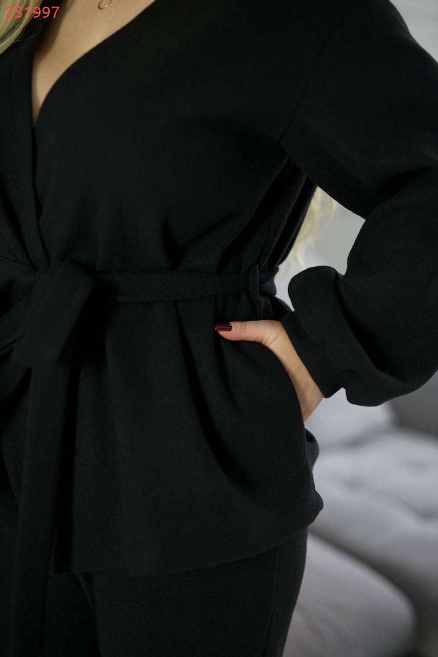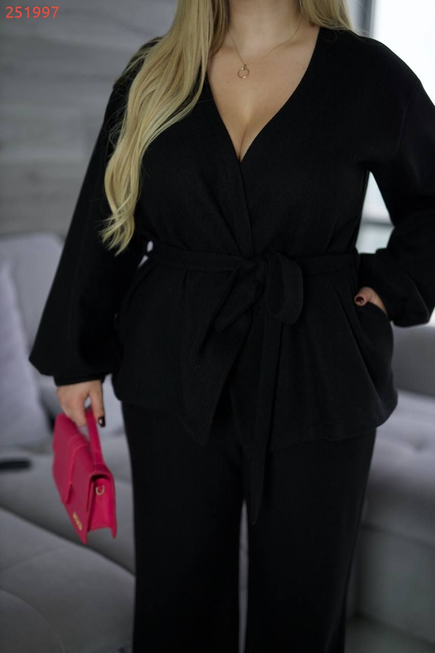 Комплект складається з вільного жакета із запахом і пояса та прямих широких брюк.