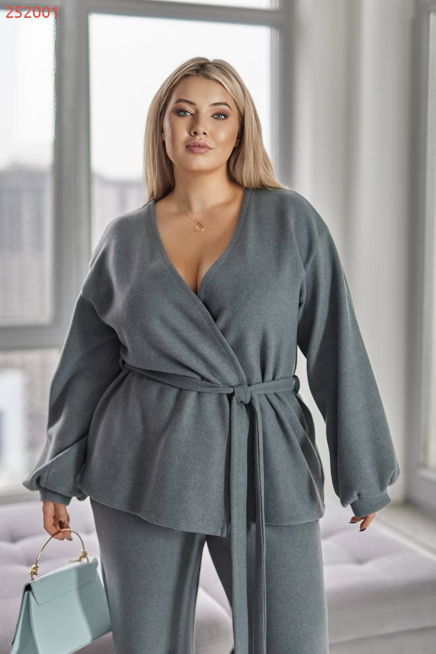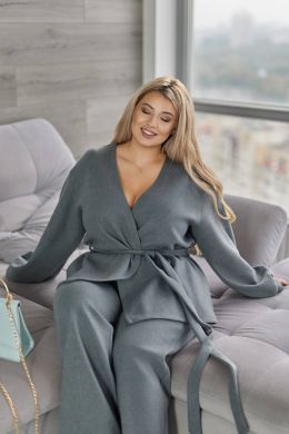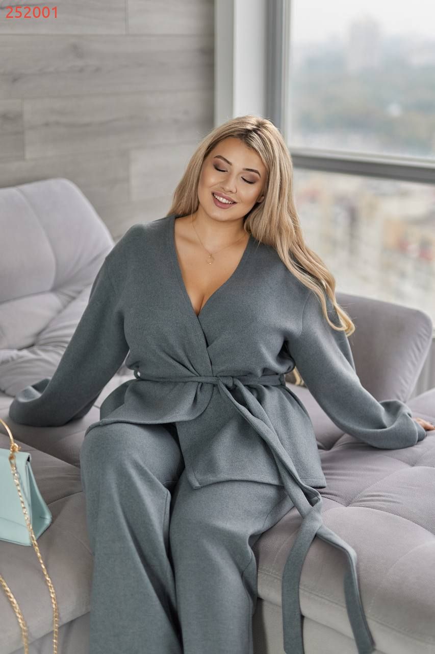 Комплект складається з вільного жакета із запахом і пояса та прямих широких брюк.