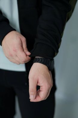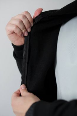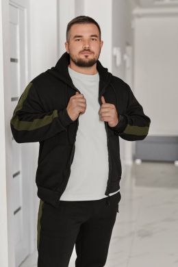 Худі прямого силуету, має зручний капюшон зі шнурками та центральну застібку-блискавку. Дві кишені кенгуру надають практичності. Низ виробу та манжети рукава на широкому трикотажному манжеті .Контрастні лампаси на рукавах і штанах роблять образ виразним та сучасним.
