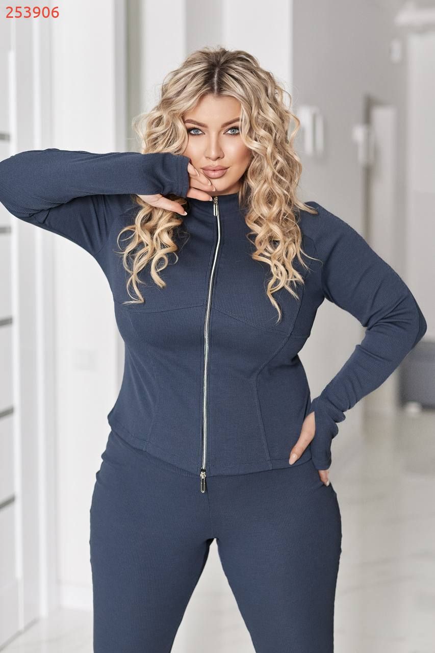 Стильний жіночий костюм-ідеальне поєднання комфорту та виразного силуету. Комплект складається з приталеної кофтинки на блискавці з двома бігунками і горловиною комір -стійка.Кофта з рельєфами красиво акцентує талію та груди, а подовжені манжети з вирізом під великий палець додають сучасного, спортивно-шикарного настрою. Брюки в талії на резинці, з високою посадкою та розкльошені від коліна , що візуально подовжують ноги й підкреслюють фігуру.