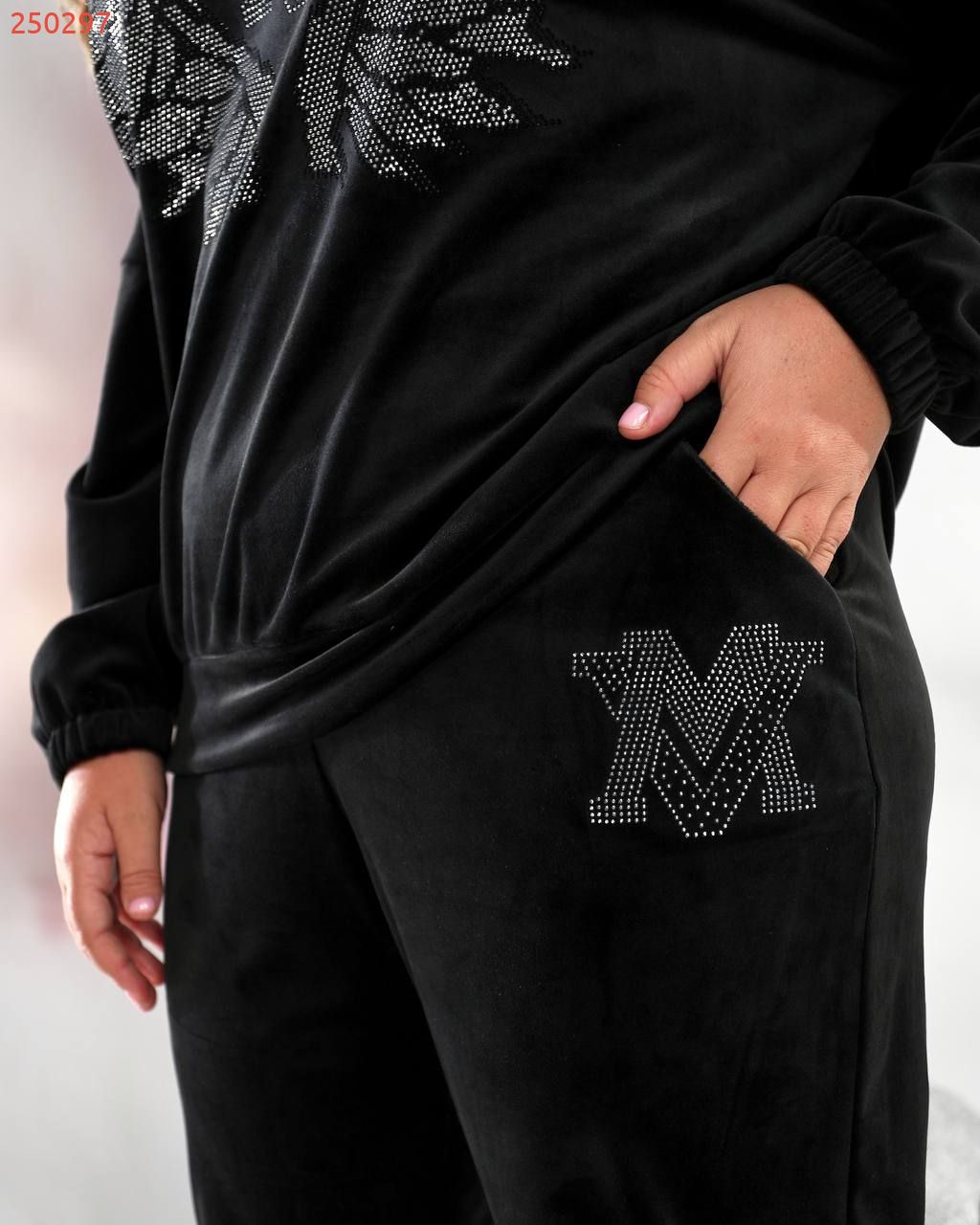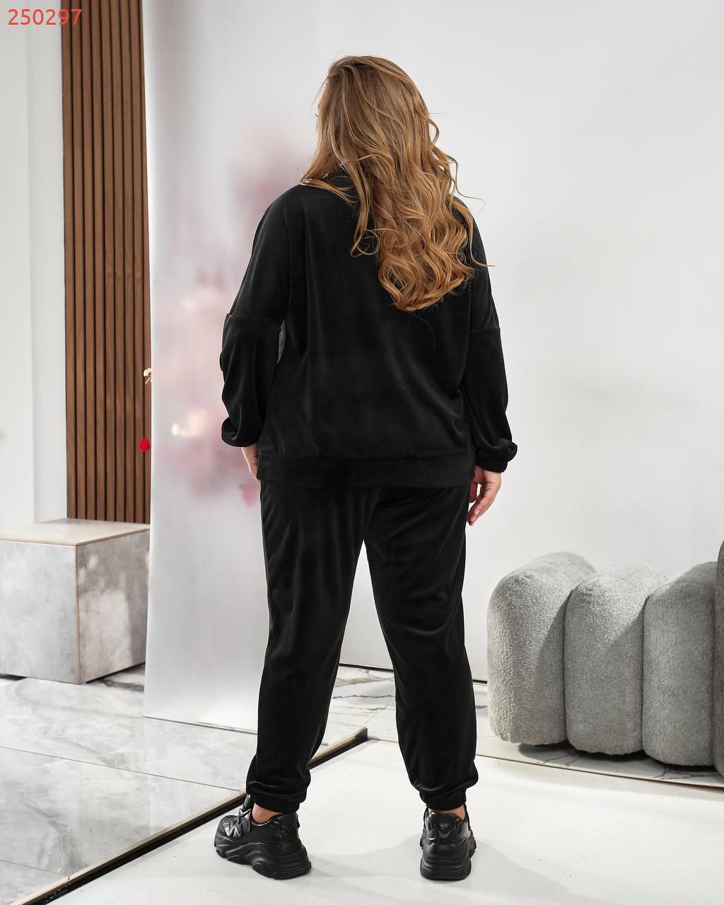 Модель складається з вільного світшота з V-подібним вирізом, а також зручних штанів на манжетах.
