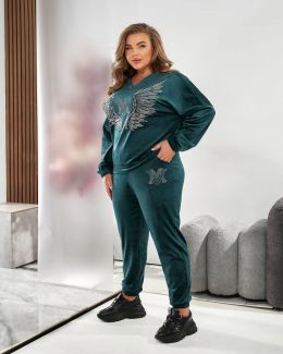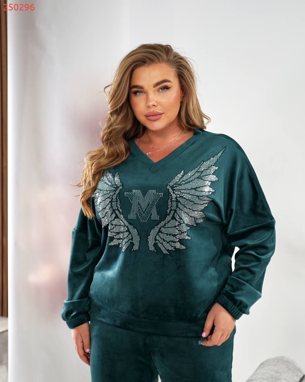 Модель складається з вільного світшота з V-подібним вирізом, а також зручних штанів на манжетах.