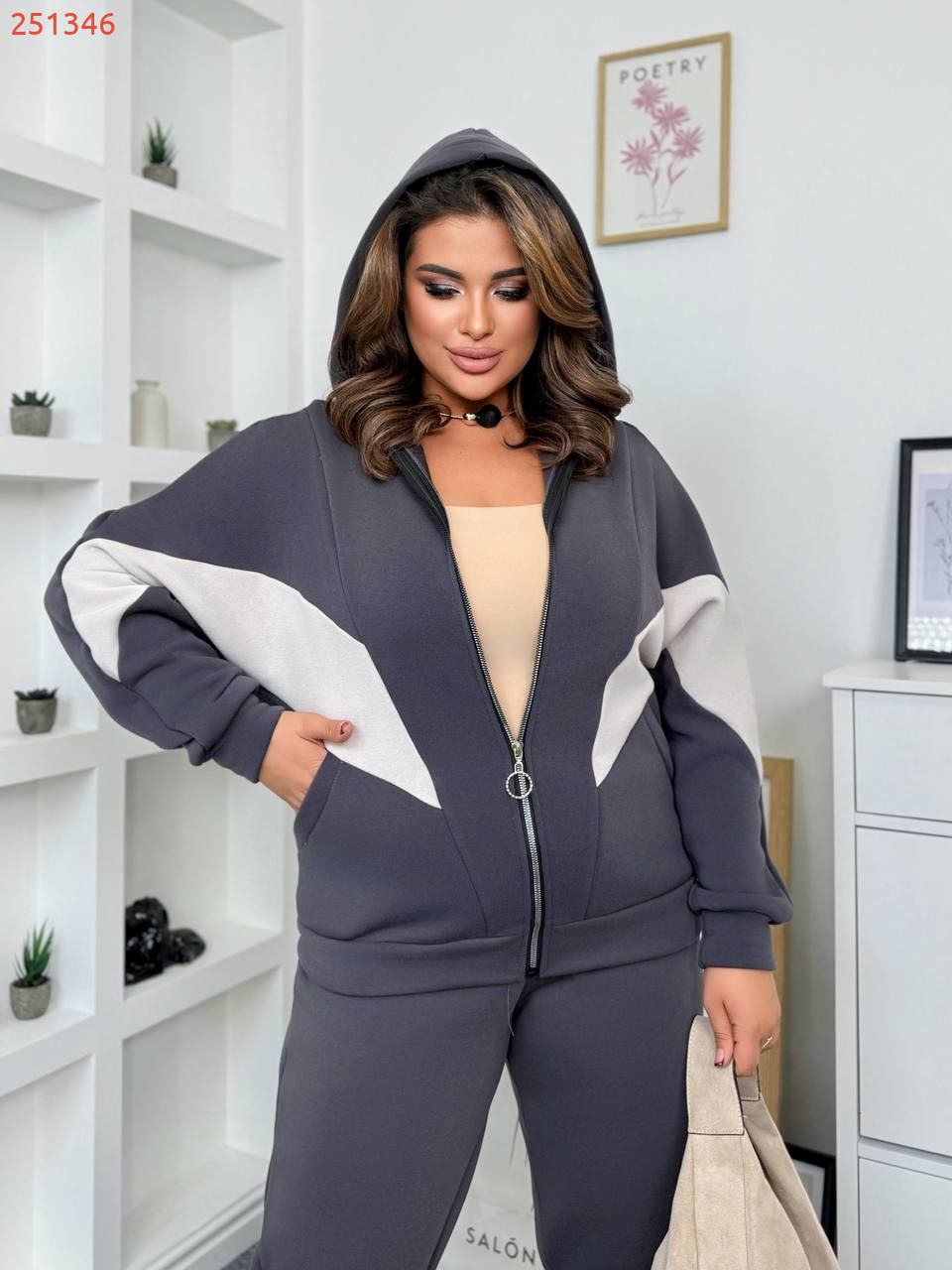 Спортивний костюм-це худи на блискавці з капюшоном, виконане з щільного тринитки. На грудях та рукавах є світлі вставки у вигляді геометричних форм, які додають образу динамічності. Худі має передні кишені та застібку на блискавку з кільцевим бігунком.