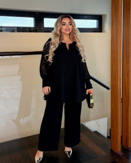 Туніка А-подібного силуету, завдяки чому чудово приховує будь-які недоліки фігури та підкреслює переваги. Горловина оригінальної форми. Рукави із гарного гіпюру в тон основної тканини, на манжетах. З боків невеликі розрізи. Застібок, кишень немає.