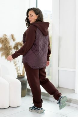 Спортивний костюм із кофтою на змійці, пошитий із поєднання тканин "стежка" та трьохнитки, створений для комфорту та стилю. Кофта оснащена капюшоном зі шнурком, що проходить через люверси, забезпечуючи захист і регулювання. Спереду розташовані врізні кишені для зручності. Рукава з трьохнитки з манжетами забезпечують комфортну посадку. Штани з високою посадкою на еластичній гумці з боковими кишенями і манжетами внизу додають функціональності та забезпечують тепло. Ідеальний вибір для активного відпочинку чи повсякденних занять.