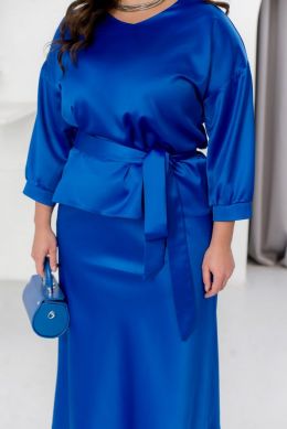 Елегантний святковий костюм зі спідницею, створений із розкішного костюмного шовку, стане вашим ідеальним образом для новорічних свят. Він поєднує витонченість і комфорт, роблячи вас зіркою будь-якої святкової події. Блуза з V-подібним вирізом створює акцент на зоні декольте, додаючи образу жіночності. Спущена лінія плечей та рукави довжиною 3/4 з манжетами на ґудзиках забезпечують стильний вигляд і зручність. Довга спідниця на резинці комфортно сідає по фігурі, а текстильний пояс, що входить до комплекту, дозволяє підкреслити талію та додає завершеності образу. Цей костюм створений, щоб ви відчували себе впевнено й виглядали розкішно під час зустрічі Нового року чи будь-якого іншого особливого заходу.
