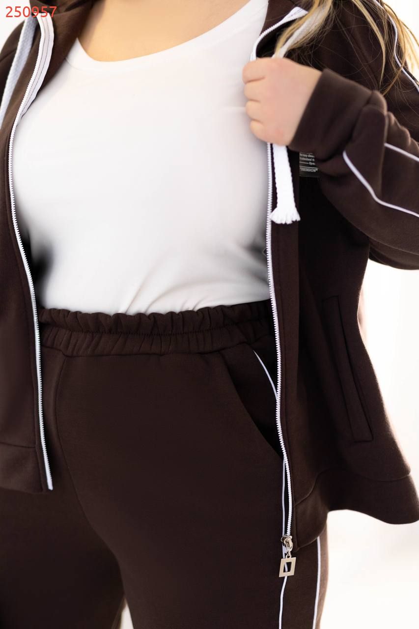 Штани висока посадка, вільного крою прикрашені стрічками , що візуально витягую ніжку.Мають еластичний пояс що забезпечує відмінну посадку та комфорт при русі. У штанах є кишені в бокових швах . На штанах стильні лампаси які, гарно поєднуються .Спортивний костюм доступний у різних кольорах та розмірах, що дозволяє вибрати відповідний варіант для кожного клієнта. У цьому костюмі ви будете себе відчувати комфортно, підійде для прогулянок, заняття спортом або просто для відпочинку.