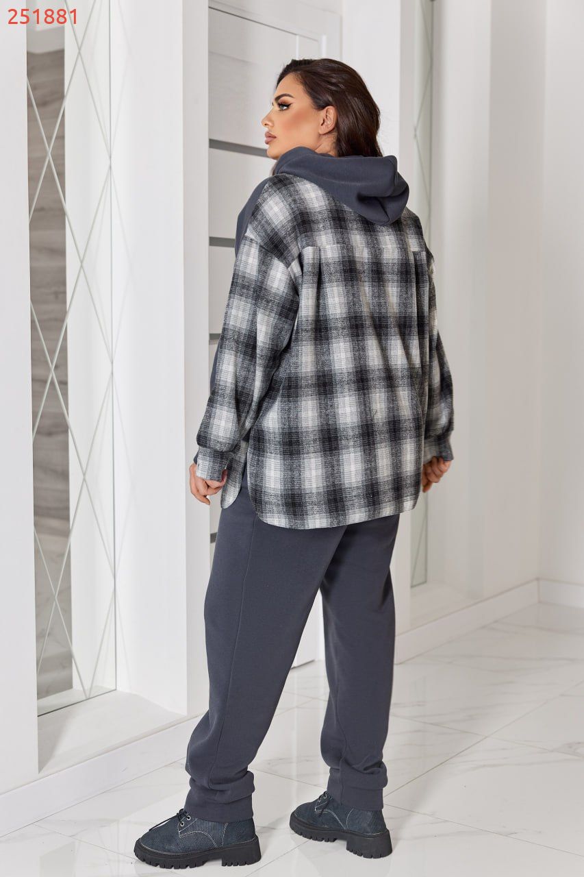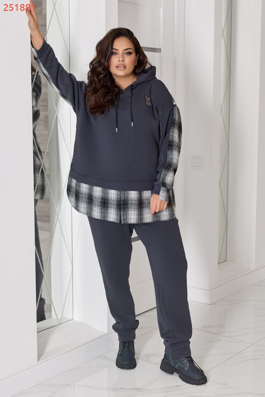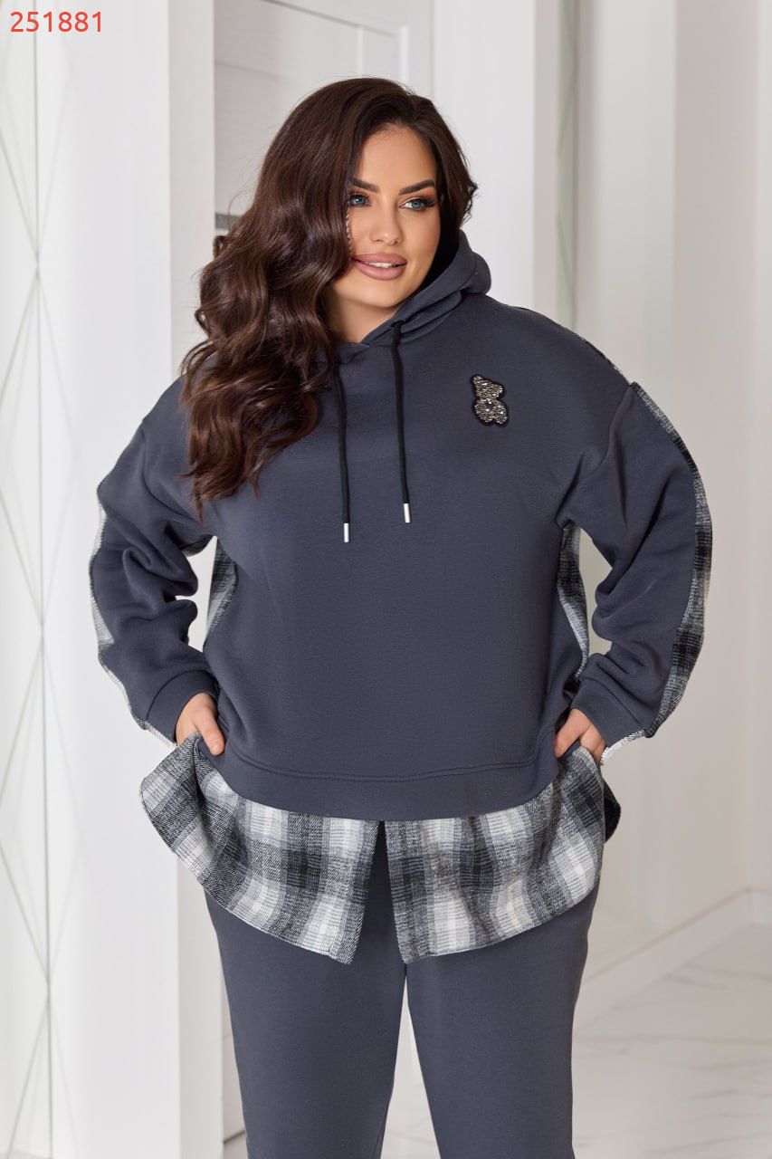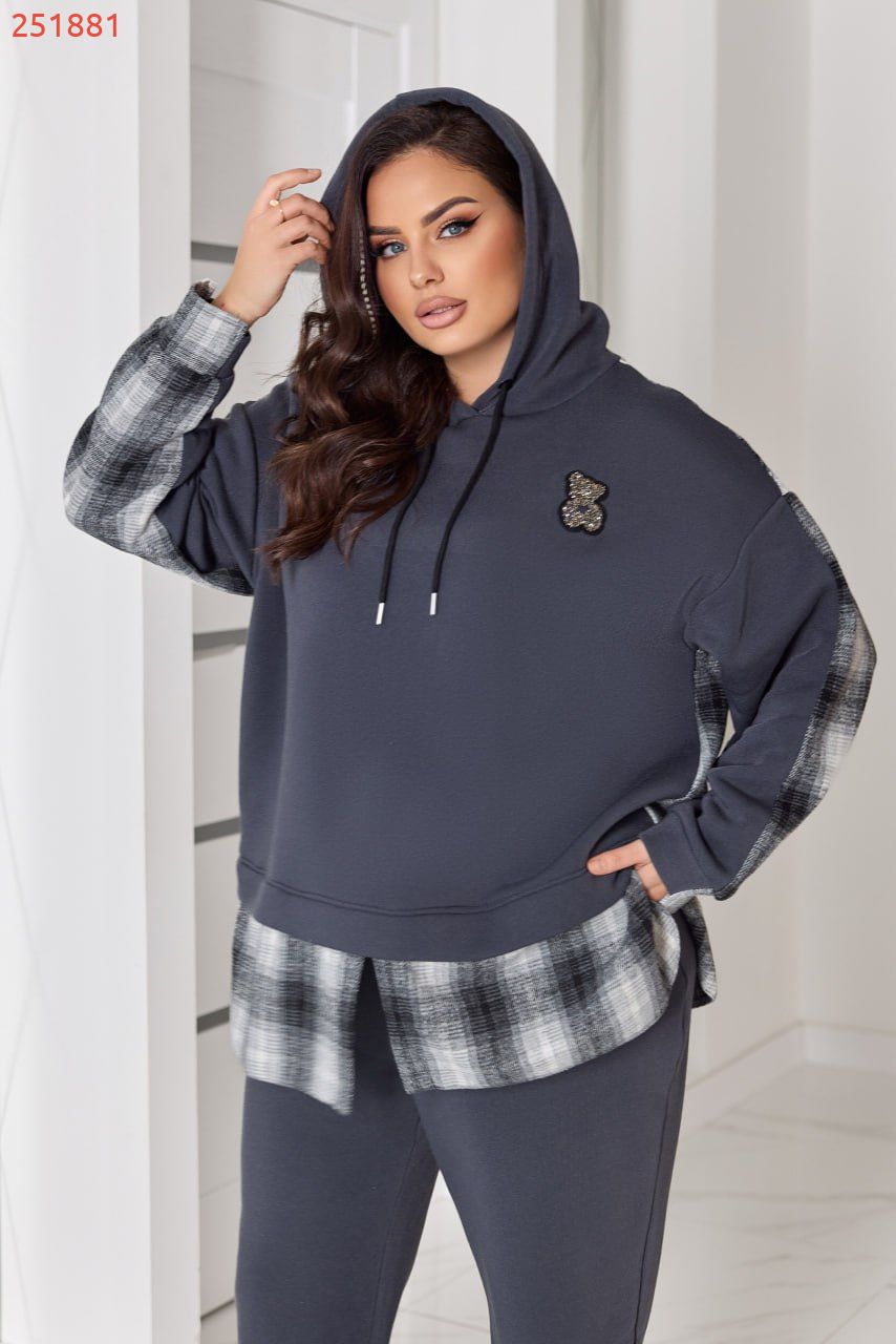 Комбінований теплий костюм із тринитки на флісі та байки в клітинку: штани середньої посадки на резинці з кишенями й оверсайз худі з капюшоном, розрізами з боків та трендовим декором «ведмедик». Ідеальний для затишних прогулянок та активних днів!