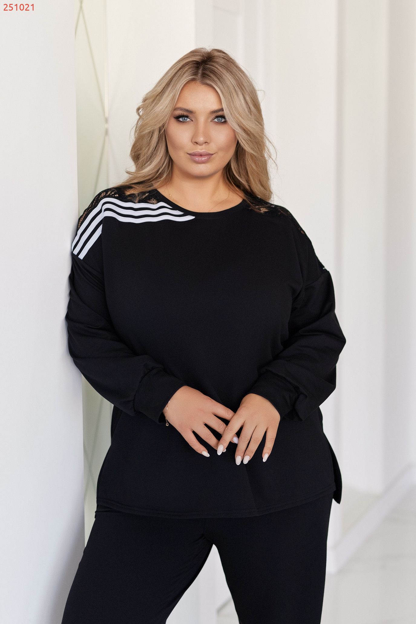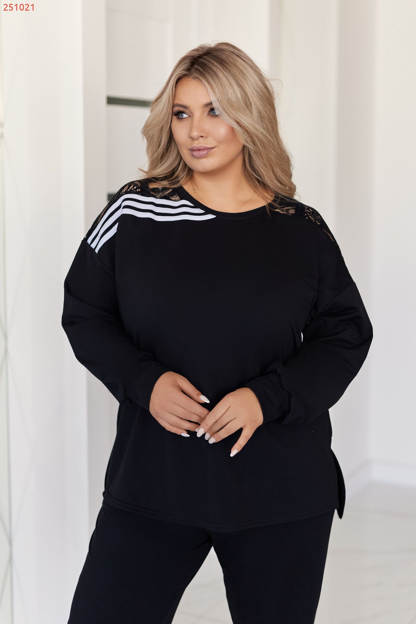 ●Світшот вільного крою з округлою горловиною та довгим рукавом на манжеті, по боках розрізи.