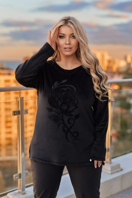 ●Світшот вільного крою з довгим рукавом, прикрашений аплікацією з того ж велюру у вигляді об’ємної квітки на грудях.