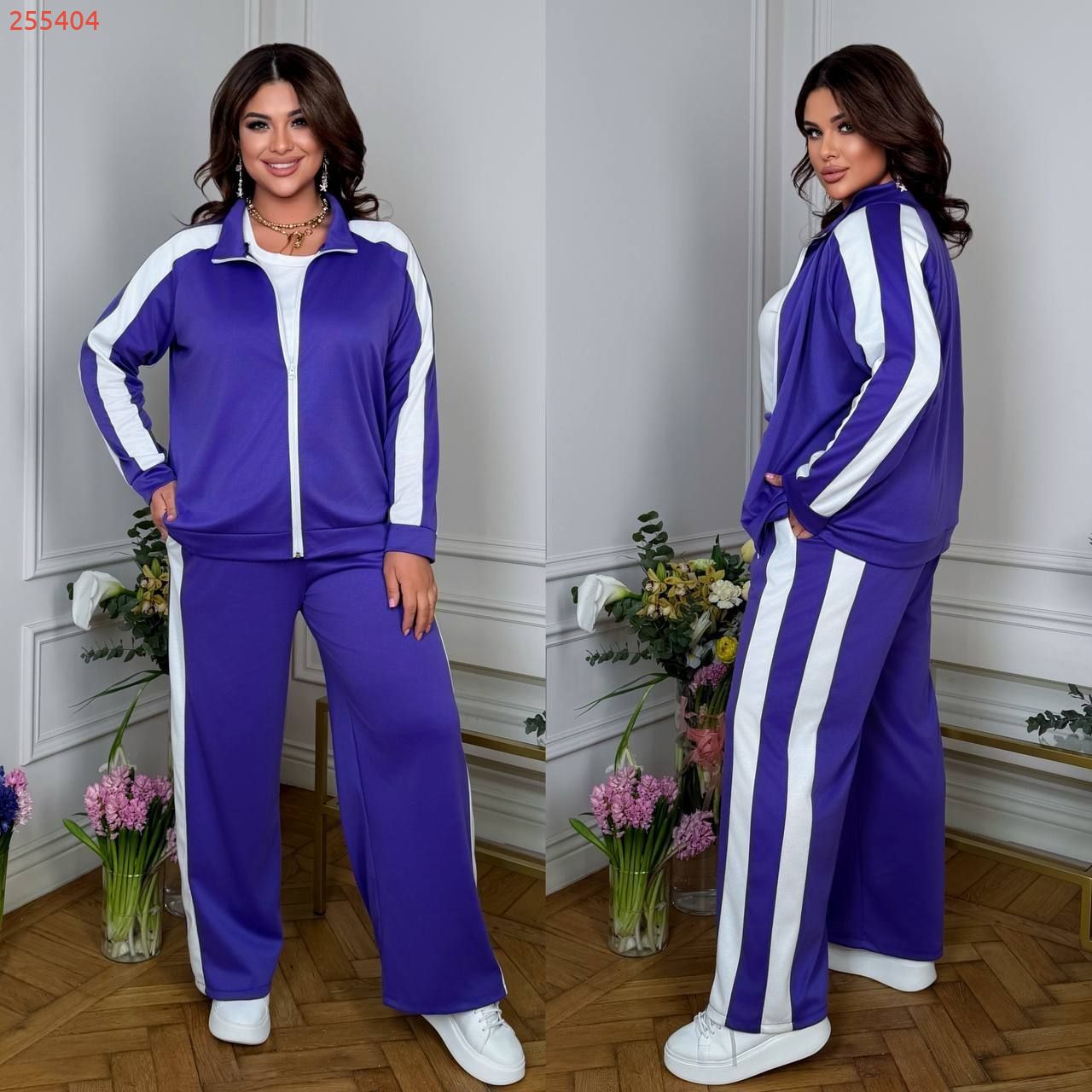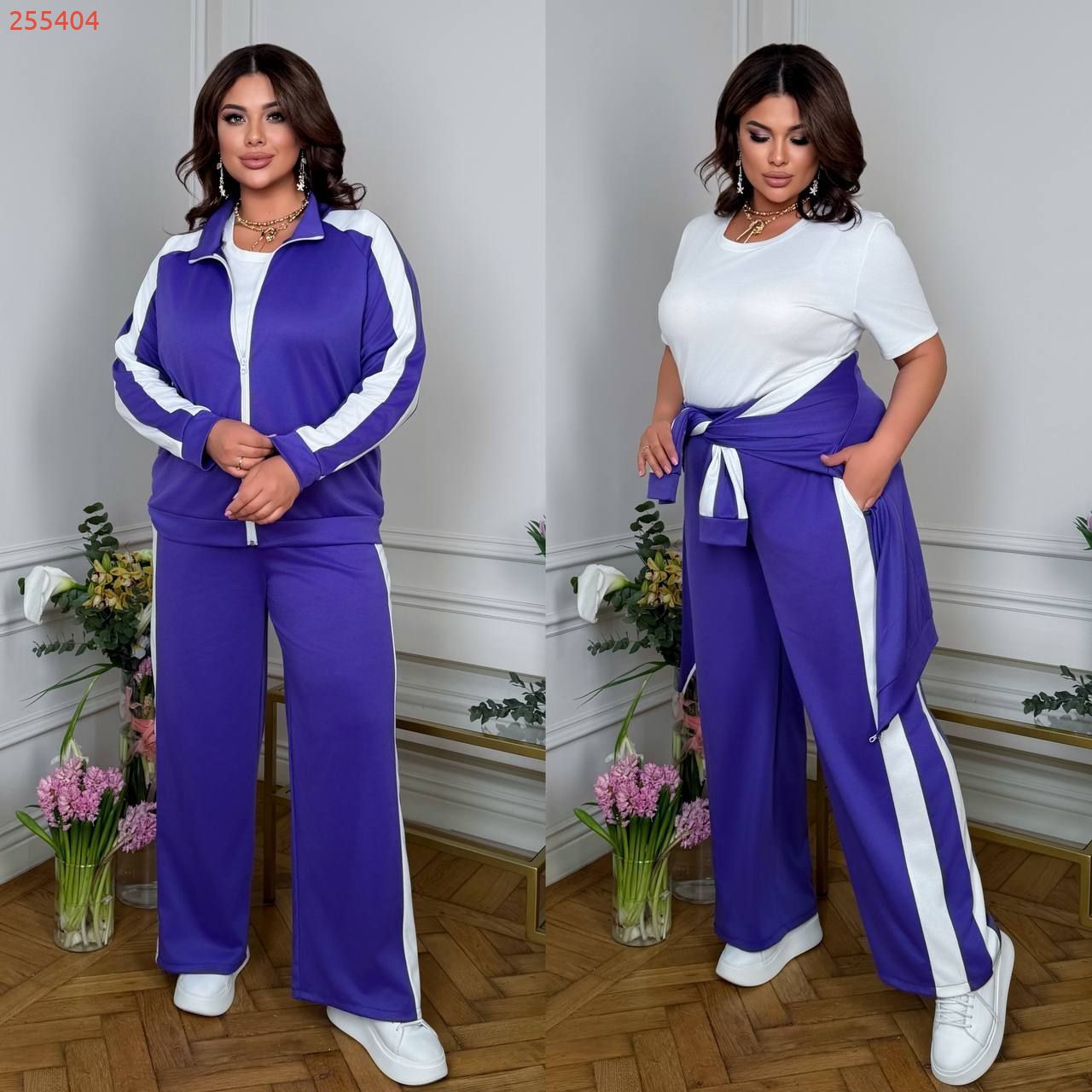 Стильний костюм трійка : кофта + футболка + штани . Футболка прямого покрою , кофта на блискавці , рукав з ломпасом . Штани з ломпасом , високою посадкою , пояс на гумці , з бічними кишенями .