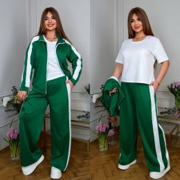 Стильний костюм трійка : кофта + футболка + штани . Футболка прямого покрою , кофта на блискавці , рукав з ломпасом . Штани з ломпасом , високою посадкою , пояс на гумці , з бічними кишенями .