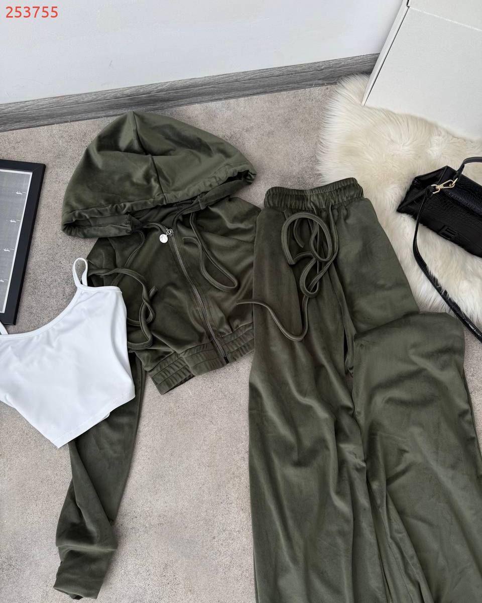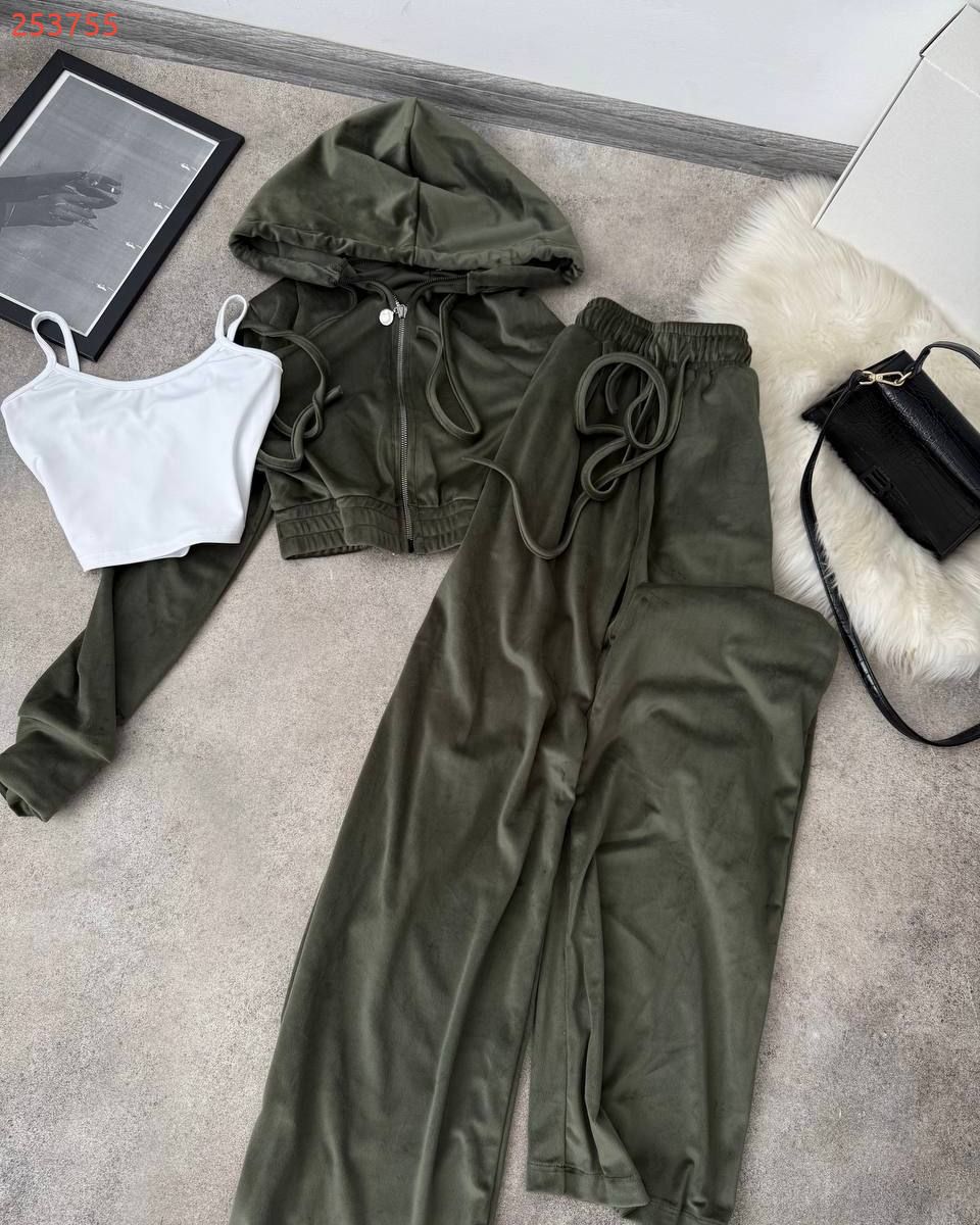 Дуже практичний костюм з кофти, штанів та топу - ідеально до будь-якого сезону. Приємна мʼяка тканина. Кофта на змійці та з капюшоном. Штани на резинці та мають кармани. Топ на бретелях, тягнеться по фігурі.