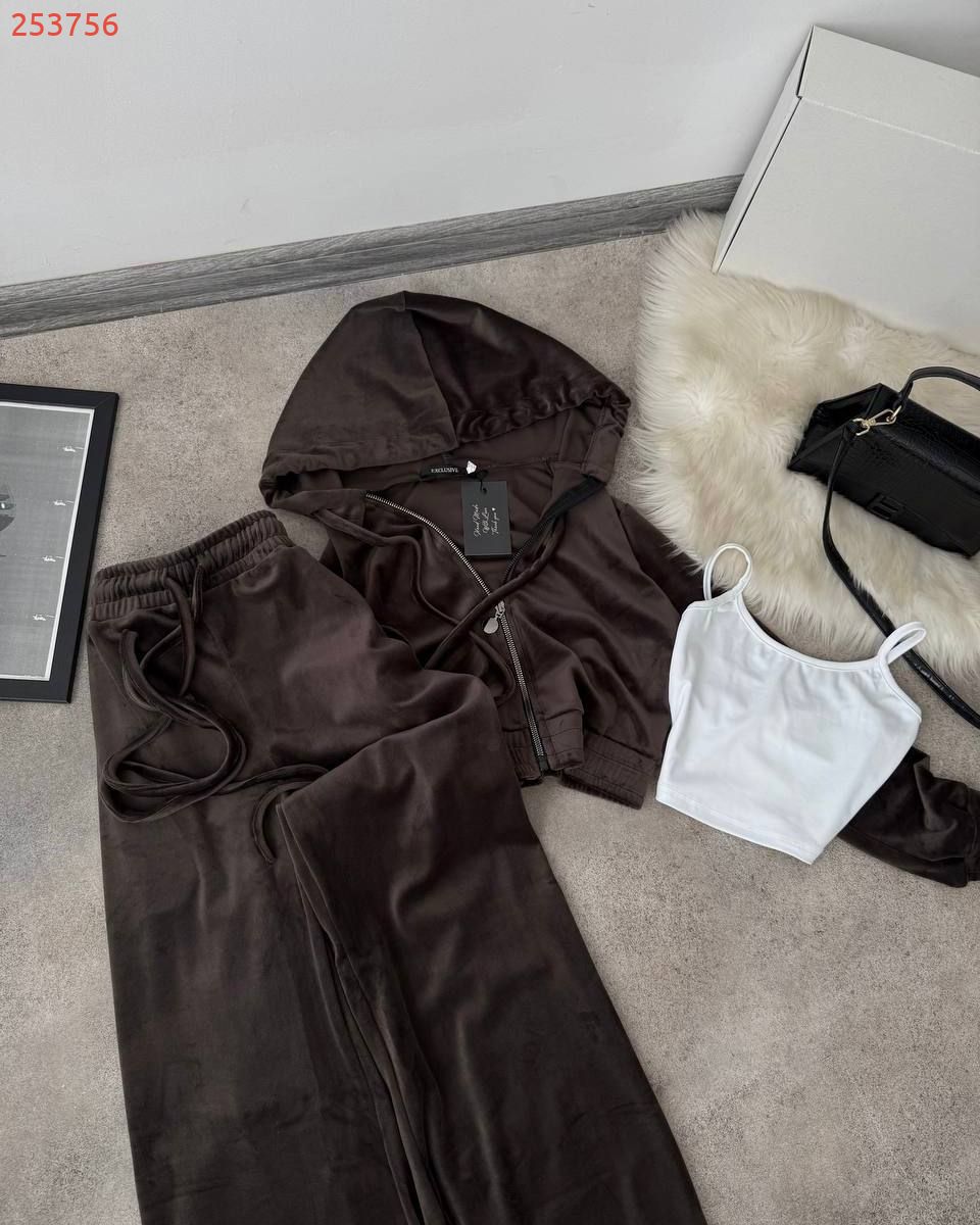Дуже практичний костюм з кофти, штанів та топу - ідеально до будь-якого сезону. Приємна мʼяка тканина. Кофта на змійці та з капюшоном. Штани на резинці та мають кармани. Топ на бретелях, тягнеться по фігурі.