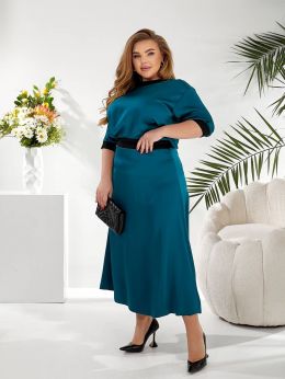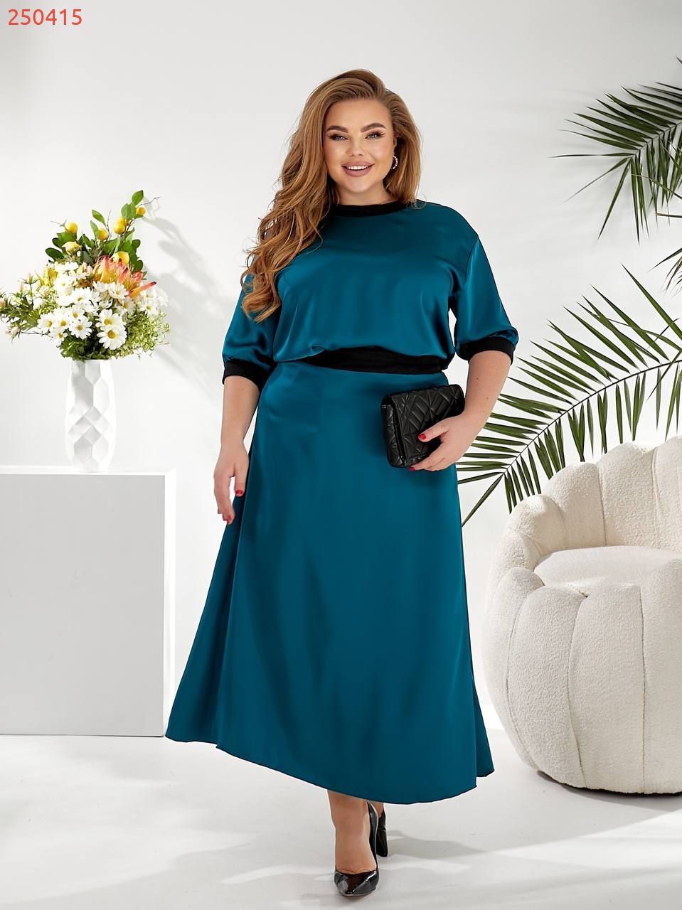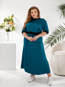 Костюм складається з вільної блузи з короткими рукавами та спідниці міді. У блузи округлий виріз горловини та контрастні чорні вставки на манжетах та комірі, що додає виразності образу.