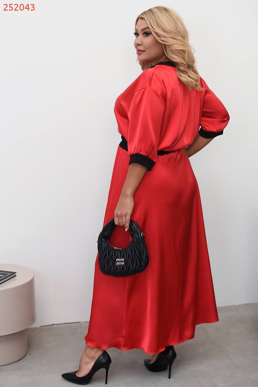 Талія підкреслена тонким чорним ременем, створюючи жіночний силует. Спідниця, що струмує, довжиною нижче коліна, що робить образ витонченим і елегантним.