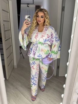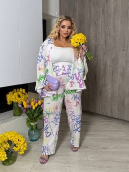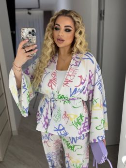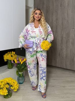 Довжина брюк 77/110. Пояс на гумці, висока посадка. Кардиган одягається на запах, підвʼязується поясом . Рукава внизу широкі, є знімни завʼязки, якими можна зробити іншу форму рукава завʼязав їх.