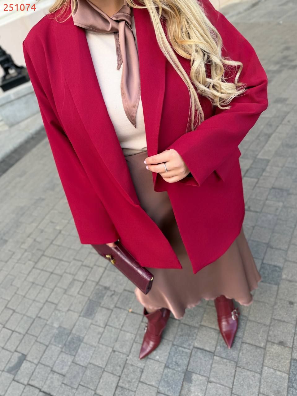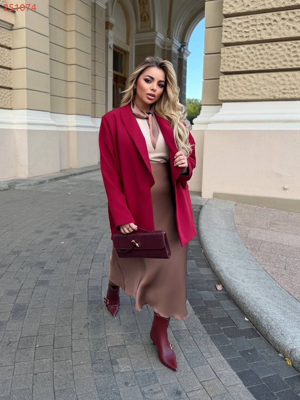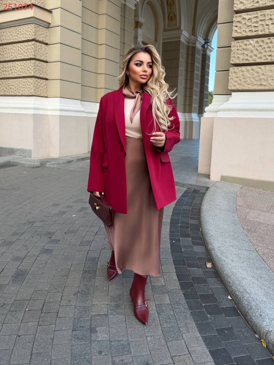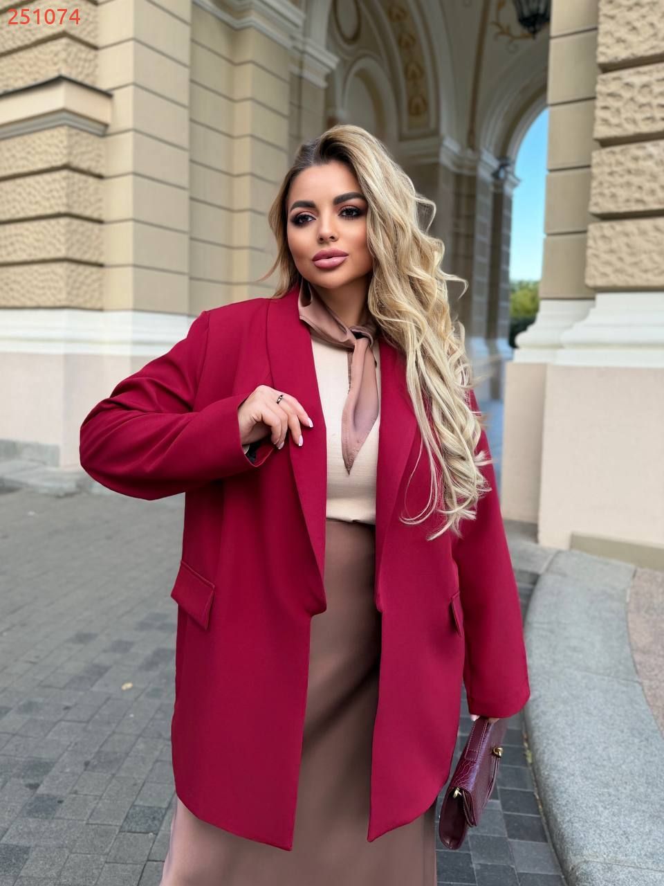 Матеріал: костюмна тканина – щільна, м’яка та тримає форму. Піджак має підкладку та підплечники.