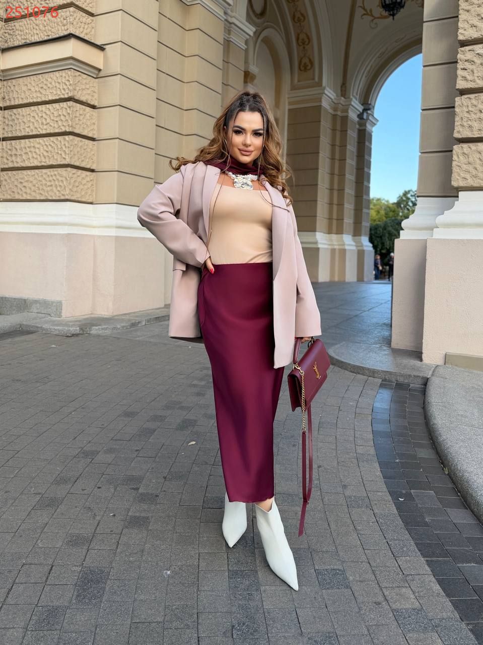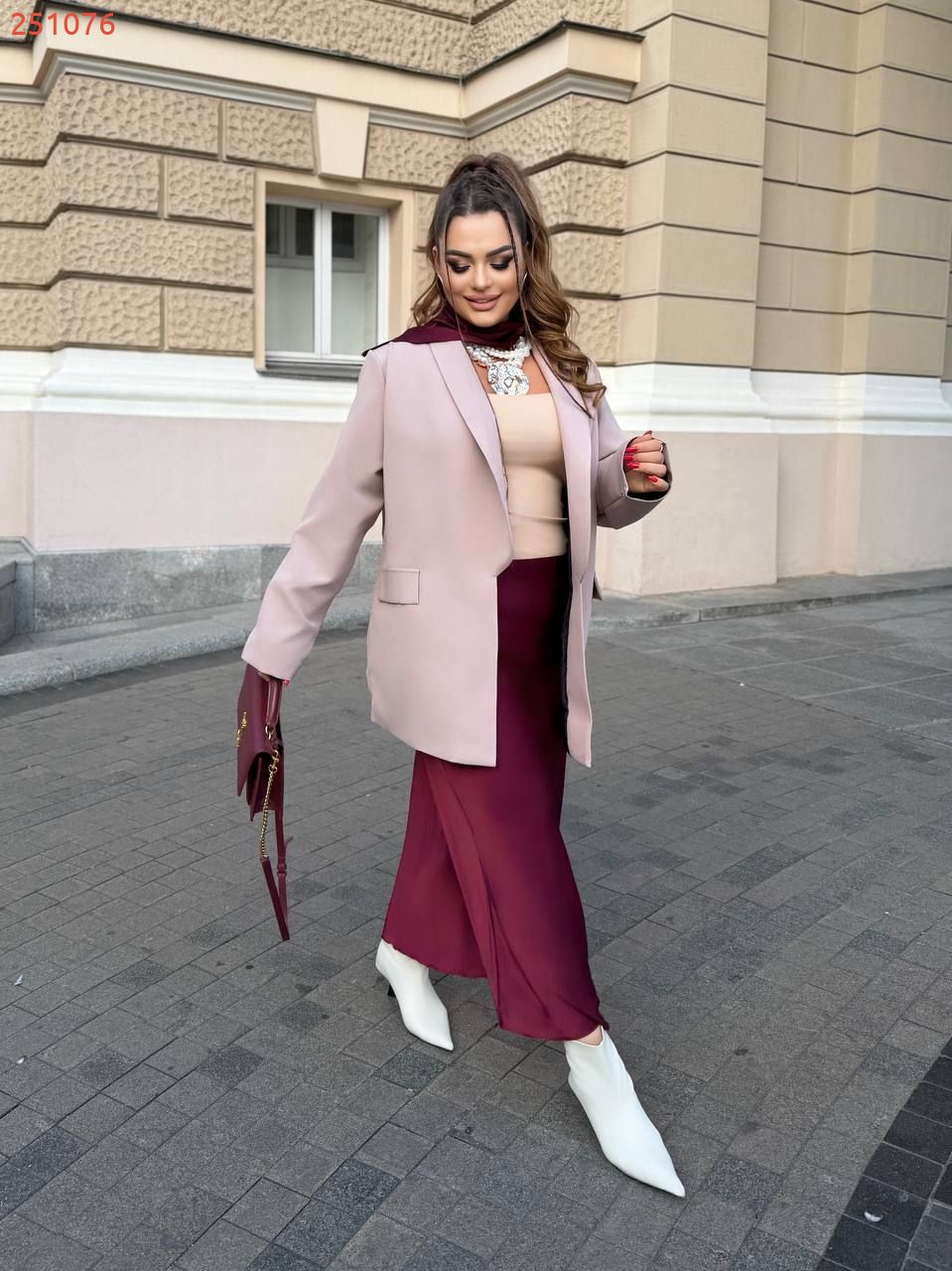 Матеріал: костюмна тканина – щільна, м’яка та тримає форму. Піджак має підкладку та підплечники.