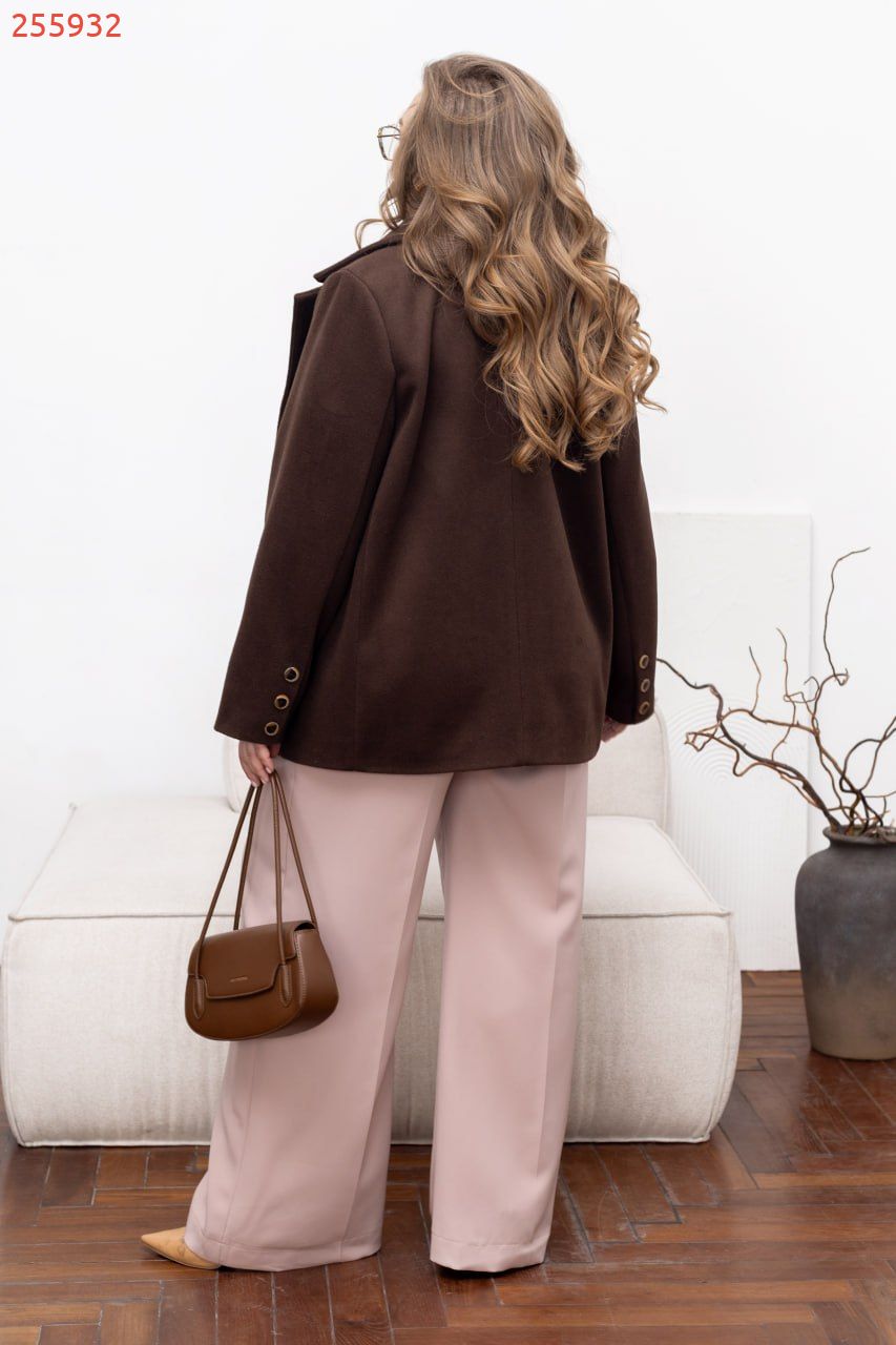 Стильне жіноче пальто, яке поєднує лаконічність і бездоганну посадку. Модель прямого, злегка вільного крою, що м’яко лягає по фігурі та не обмежує рухів. Довжина до середини стегна – універсальний варіант, який легко вписується як у повсякденні, так і більш зібрані образи. Пальто має класичний відкладний комір із лацканами, що формує елегантний силует і додає структурності. Застібка на два ґудзики, розташовані в один ряд, підкреслює мінімалістичний дизайн. Лінія плеча акуратна, рукави прямі, повної довжини – виглядають стримано та сучасно. Спереду розташовані прорізні кишені з клапанами, які додають практичності та завершеності виробу. Тканина щільна, приємна на дотик, добре тримає форму та забезпечує комфорт у прохолодну погоду. Внутрішня частина виконана з підкладкою для додаткової зручності. Пальто легко комбінується з базовими речами – від класичних брюк до деніму, створюючи стильні, стримані образи на кожен день. Пояс НЕ входить в комплект.