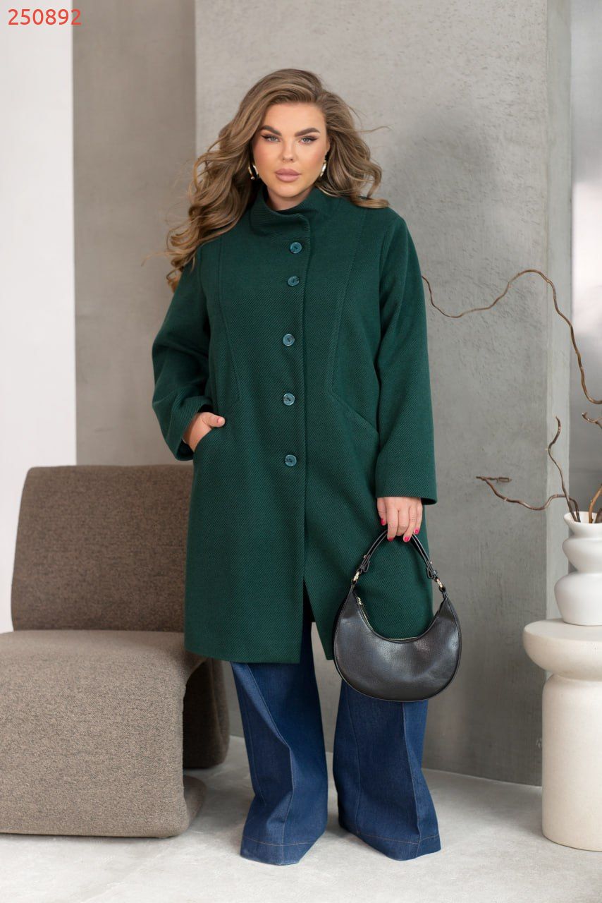 Вільний крій дарує легкість і свободу рухів, а комір-стійка додає образу елегантної стриманості. Стильний декоративний шов підкреслює силует і надає особливого шарму. Довгі рукава створюють гармонійний баланс, а зручні кишеньки та класична застібка на ґудзики роблять пальто не лише красивим, а й неймовірно практичним.