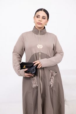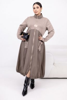 Легка елегантність з акцентом на комфорт: спортивні деталі зустрічаються з міським шиком. Стійка-горловина з блискавкою до рівня грудей + окрема блискавка від грудей донизу, комбінована фактура (двонитка + жатa плащівка), дві накладні кишені. Ззаду – декоративна шнурівка для регулювання об’єму на талії. Низ на резинці для охайної посадки.