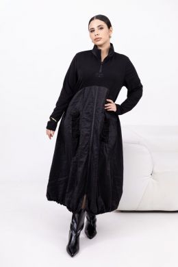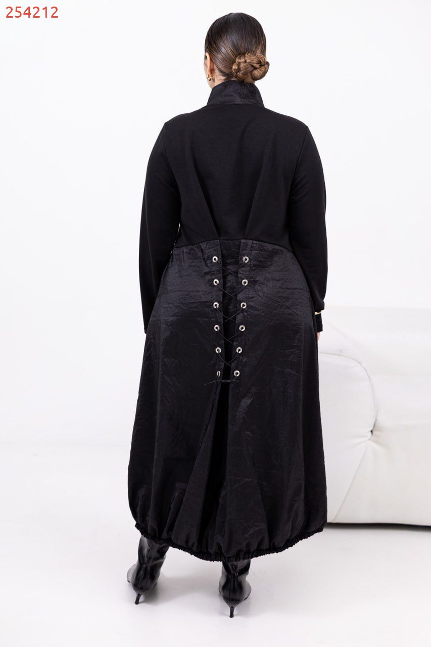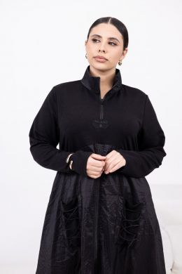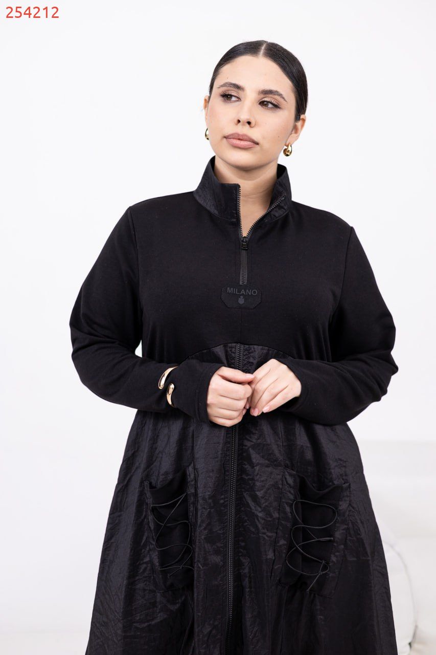 Легка елегантність з акцентом на комфорт: спортивні деталі зустрічаються з міським шиком. Стійка-горловина з блискавкою до рівня грудей + окрема блискавка від грудей донизу, комбінована фактура (двонитка + жатa плащівка), дві накладні кишені. Ззаду – декоративна шнурівка для регулювання об’єму на талії. Низ на резинці для охайної посадки.