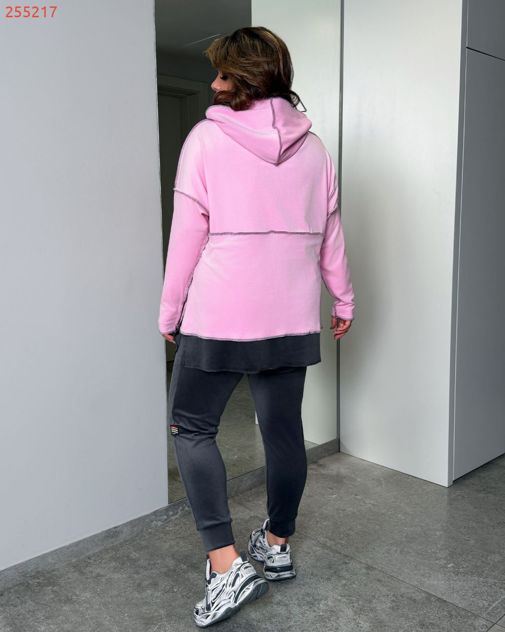 Стильний костюм виготовлений з якісного велюра, цікавий крій. Тканина м'яка та приємна до тіла. Туніка вільного крою, штани 7/8 на манжеті, висока посадка, кругова резинка. Якісні лекала.