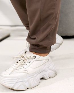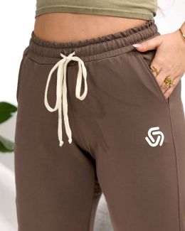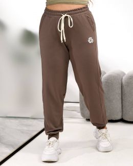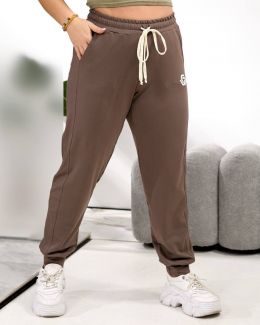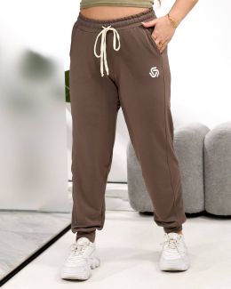 Штани прямого силуету з легким звуженням донизу, ідеальної посадки, пояс на широкій резинці з контрастним шнурком для регулювання об’єму, зручні бокові кишені, вертикальні рельєфні шви, що візуально подовжують силует. Низ штанин – на манжеті, прикрашені невеличкою лаконічною наліпкою.