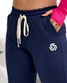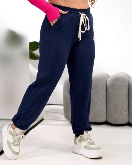Штани прямого силуету з легким звуженням донизу, ідеальної посадки, пояс на широкій резинці з контрастним шнурком для регулювання об’єму, зручні бокові кишені, вертикальні рельєфні шви, що візуально подовжують силует. Низ штанин – на манжеті, прикрашені невеличкою лаконічною наліпкою.