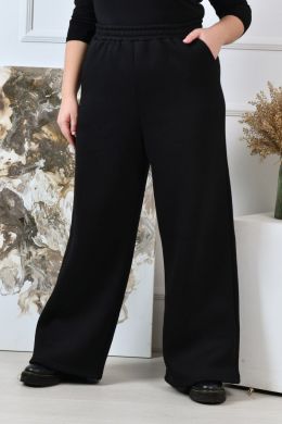 Стильні прямі широкі брюки-палаццо виготовлені з якісного трикотажу тринитка з начосом, що забезпечує середню розтяжність матеріалу та комфорт під час носіння. Ці брюки мають посадку, яка розташована трохи вище середньої, завдяки чому вони стильно підкреслюють талію, а еластична резинка по талії додає зручності і дозволяє прекрасно підлаштуватися під фігуру. В бокових швах розташовані практичні кишені, які не тільки доповнюють дизайн виробу, але й додають функціональності й зручності в повсякденному використанні.