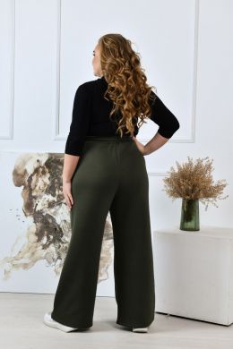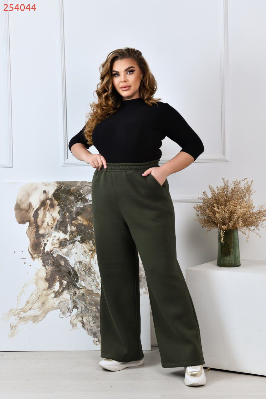 Стильні прямі широкі брюки-палаццо виготовлені з якісного трикотажу тринитка з начосом, що забезпечує середню розтяжність матеріалу та комфорт під час носіння. Ці брюки мають посадку, яка розташована трохи вище середньої, завдяки чому вони стильно підкреслюють талію, а еластична резинка по талії додає зручності і дозволяє прекрасно підлаштуватися під фігуру. В бокових швах розташовані практичні кишені, які не тільки доповнюють дизайн виробу, але й додають функціональності й зручності в повсякденному використанні.